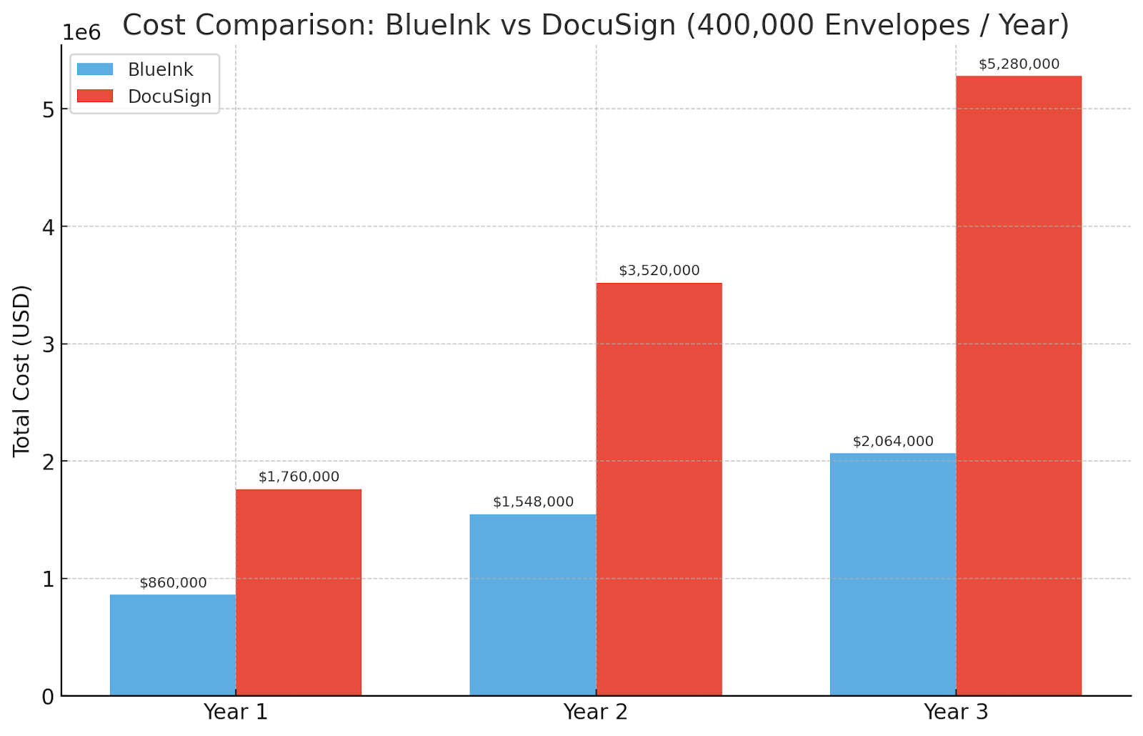 The chart below illustrates a generalized cost comparison for an enterprise processing 400,000 envelopes per year. While real-world costs vary by contract, this projection is based on Blueink’s published enterprise tiers and average DocuSign rates observed in customer migrations.