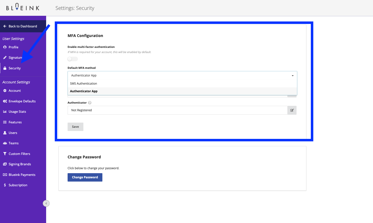 Blueink makes it simple to secure your account with Multi-Factor Authentication. You can activate MFA for individual accounts or enforce it across your entire organization.