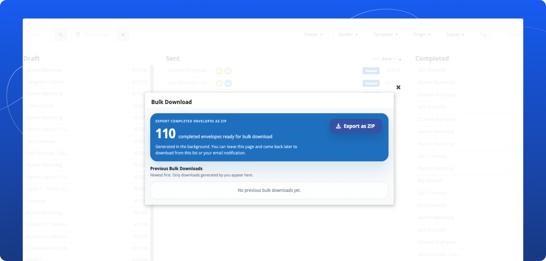 Downloading completed envelopes individually can be slow and repetitive, especially when you are managing a large volume of signed agreements, archived records, or completed transactions. When teams need to export many documents at once, handling each download separately adds unnecessary time and effort.